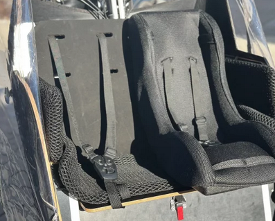 Auf der tiefsitzenden Lastenrad-Kinderbank reisen auch die Kleinsten sicher und entspannt. Die hohe Rücken- und Seitenlehne schützt die Kinder und lädt zum Schlafen ein. (Babyschale nur für Abbildungszwecke, nicht im Lieferumfang enthalten.)